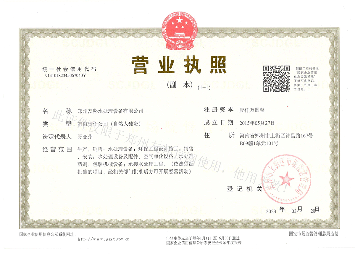 • 鄭州友邦水處理設備有限公司——營業執照